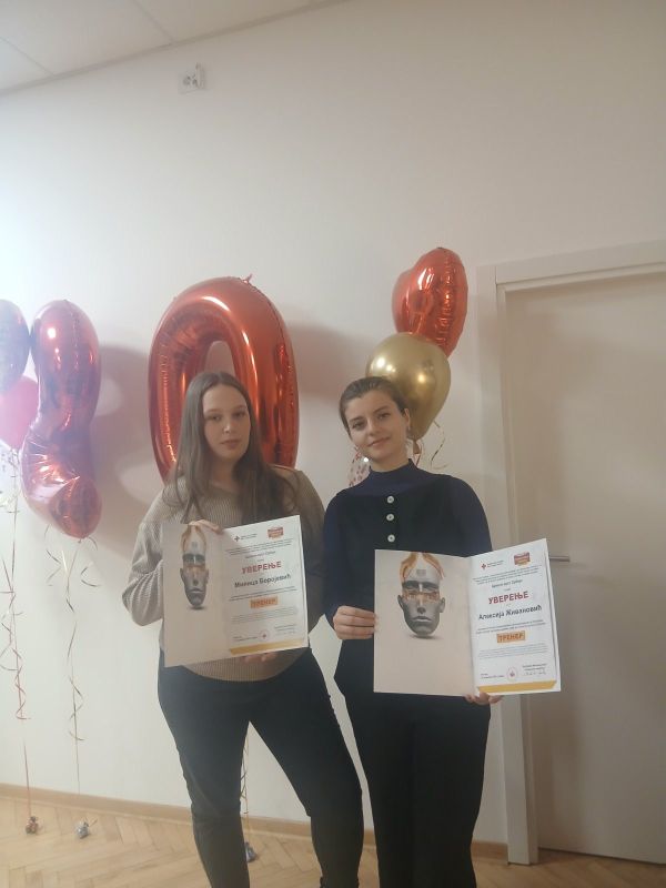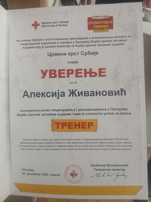 У Црвеном крсту Србије свечана додела уверења о положеном испиту за лиценцираног тренера у области програма Борба против трговине људима. Наша Алексија Живановић.